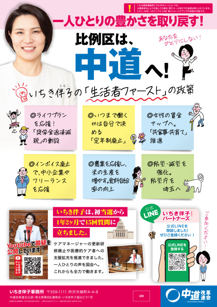 これは選挙運動用ビラのJPGバージョンです。公職選挙法により印刷しての頒布・電子メール添付での送信は禁じられています。ただし、SNS へのアップや LINE 等メッセージアプリでの送信は可能です。